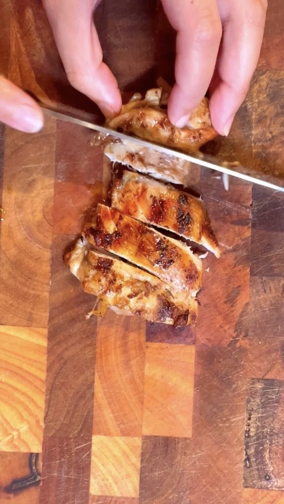 Remove the chicken from the brine and pat dry. Heat olive oil in a pan over medium heat and cook the chicken until golden on both sides and cooked through. Let rest, then slice.