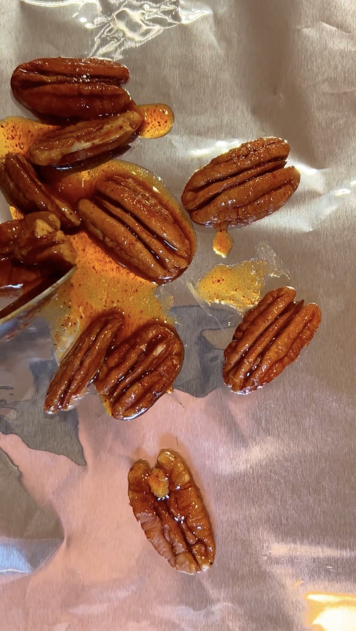 To make the spiced pecans, add the brown sugar, honey, water, cayenne, smoked paprika, and salt to a pan over medium heat. Stir until the sugar dissolves and the mixture bubbles slightly.