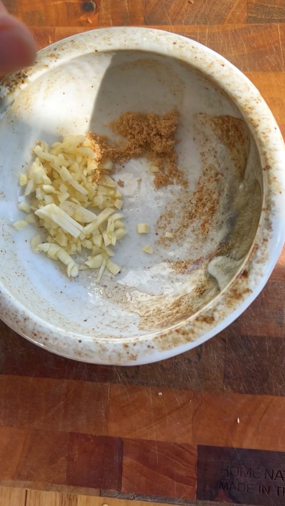 Make the sauce by combining minced garlic, brown sugar, lime juice, dark soy sauce, fish sauce, Thai chili, and garlic chili sauce. Stir until the sugar dissolves and adjust spice to taste.