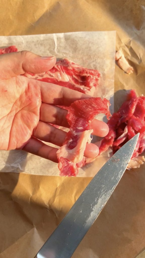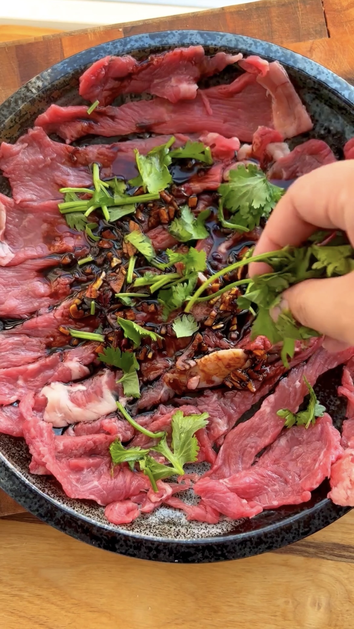 Lay the beef flat on a platter and squeeze fresh lime juice all over. This lightly “cooks” the surface and brightens everything.
