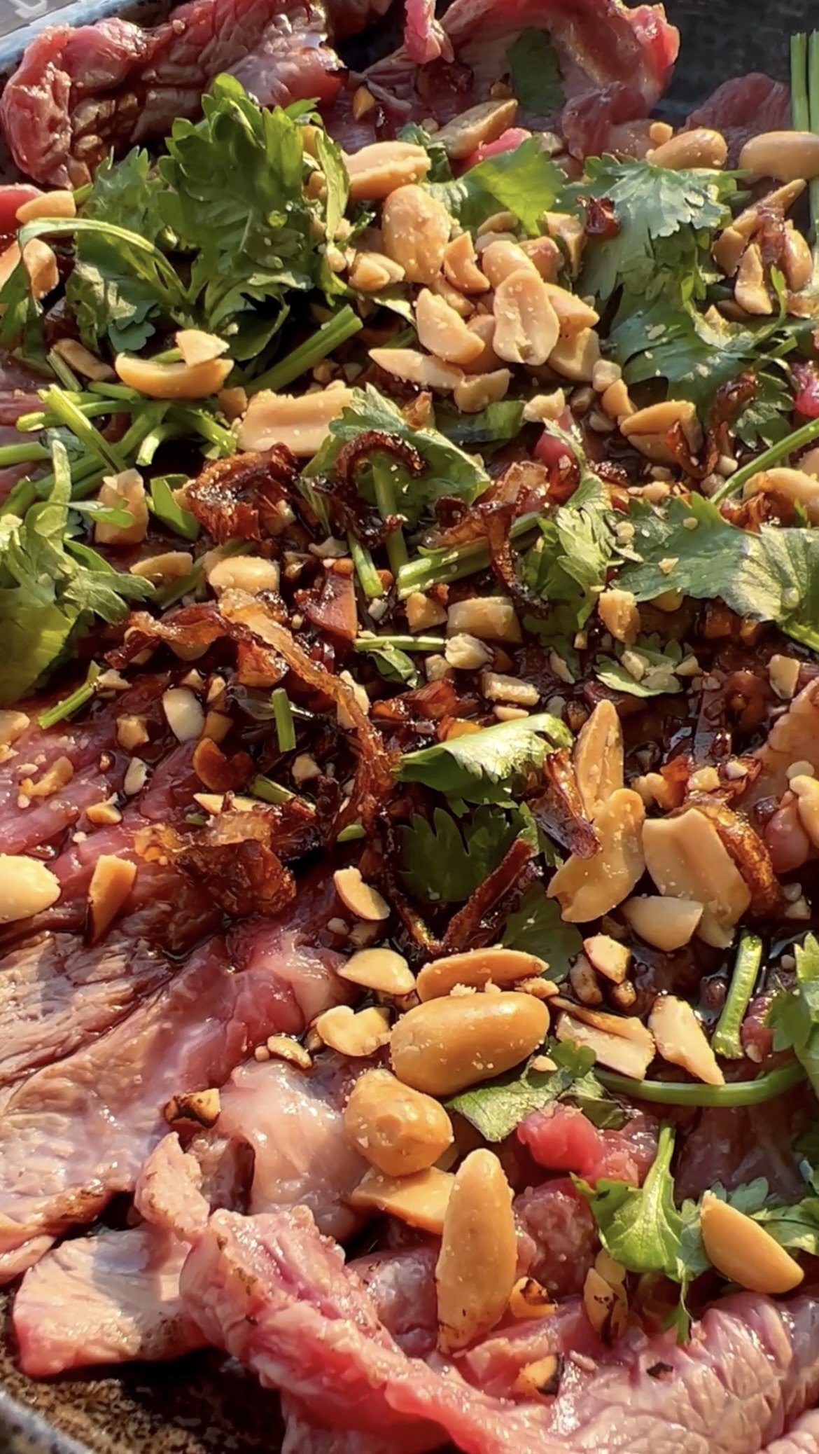 Spoon the sauce evenly over the top, then finish with cilantro, roasted peanuts, fried shallots, and Thai basil. If you want a little drama, torch the edges. If you prefer medium rare, torch the whole plate before adding toppings.