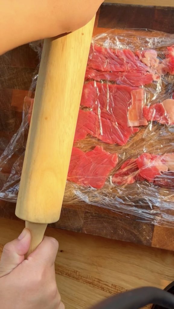 Place the beef in the freezer for 1–2 hours to firm up for easier slicing.