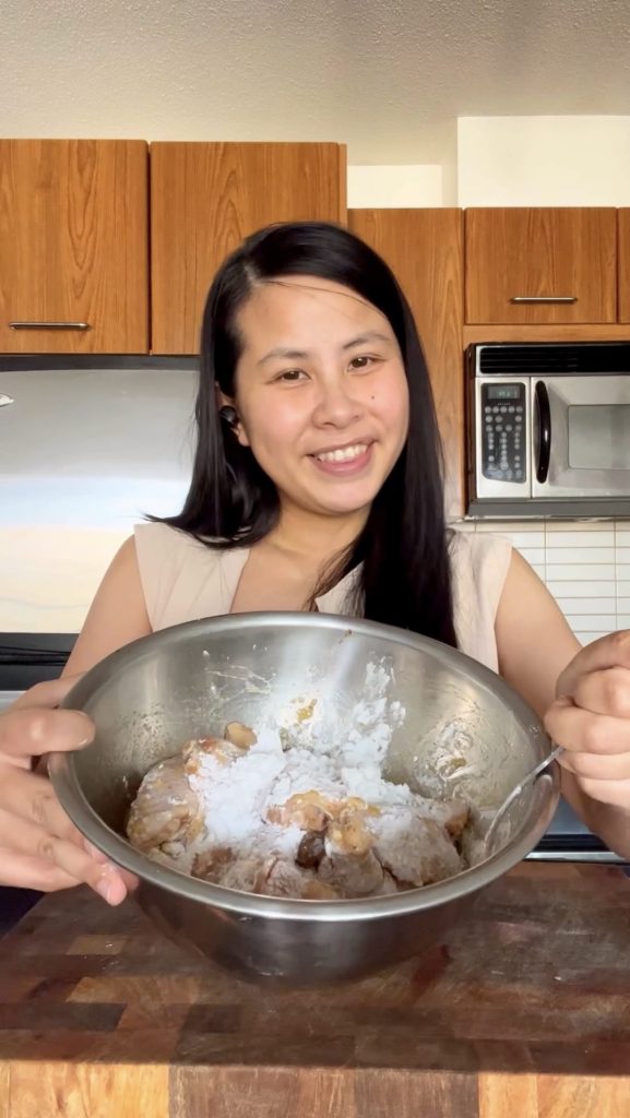 In a separate bowl, beat the egg with cornstarch. Add marinated chicken and coat evenly.