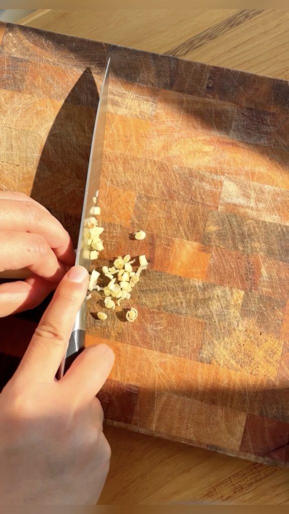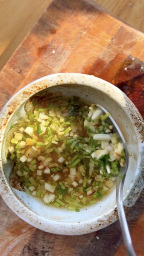 While the chicken marinates, make the sauce. Finely mince the lemongrass (white parts only), garlic, and cilantro stems, then mix with lime juice, fish sauce, honey, and water. Letting the sauce sit is key — it softens the lemongrass and deepens the flavour. I usually make it at the same time as the chicken, and sometimes even the day before.
