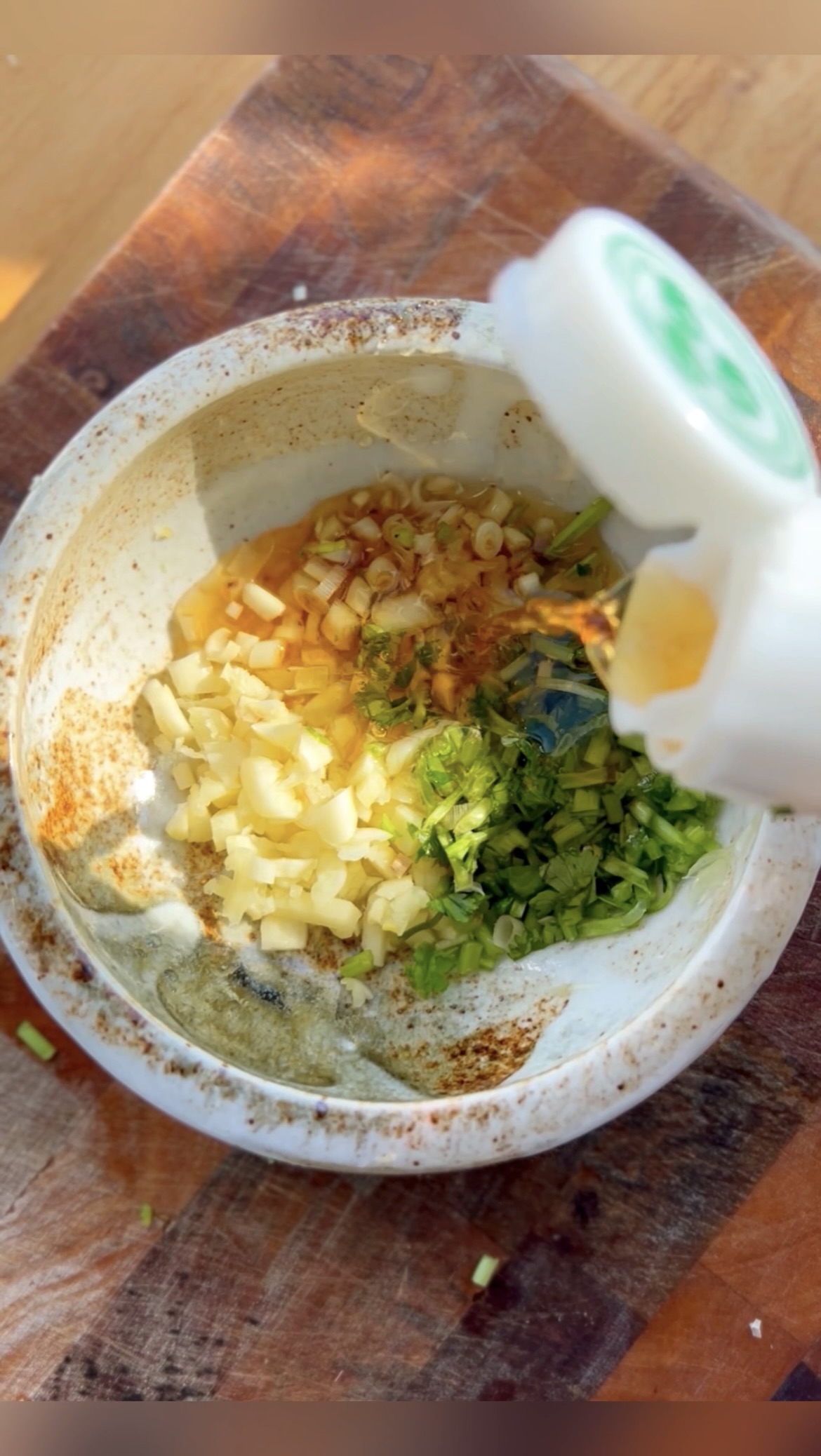 While the chicken marinates, make the sauce. Finely mince the lemongrass (white parts only), garlic, and cilantro stems, then mix with lime juice, fish sauce, honey, and water. Letting the sauce sit is key — it softens the lemongrass and deepens the flavour. I usually make it at the same time as the chicken, and sometimes even the day before.